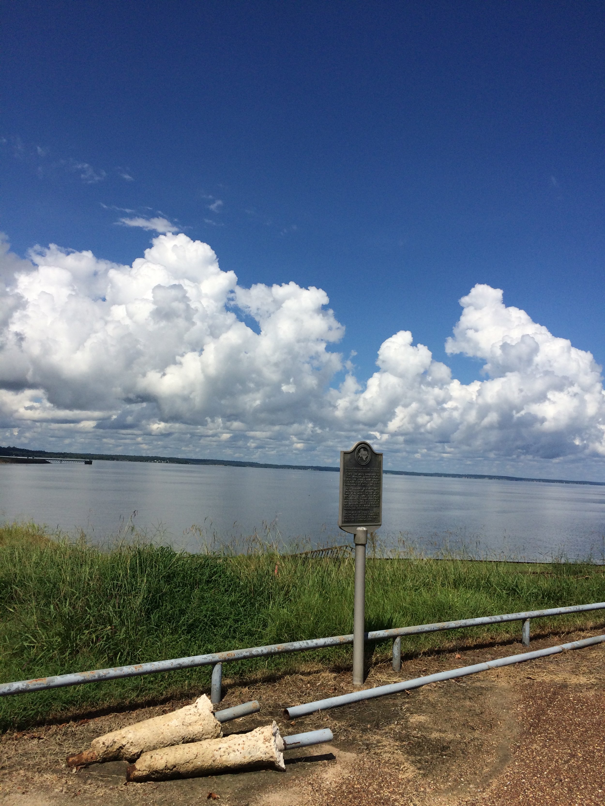 This historical marker on the “Paddlewheels of the Trinity” in the foreground of the reservoir, with the rusted fence and worn concrete seems like an apt image for this history.